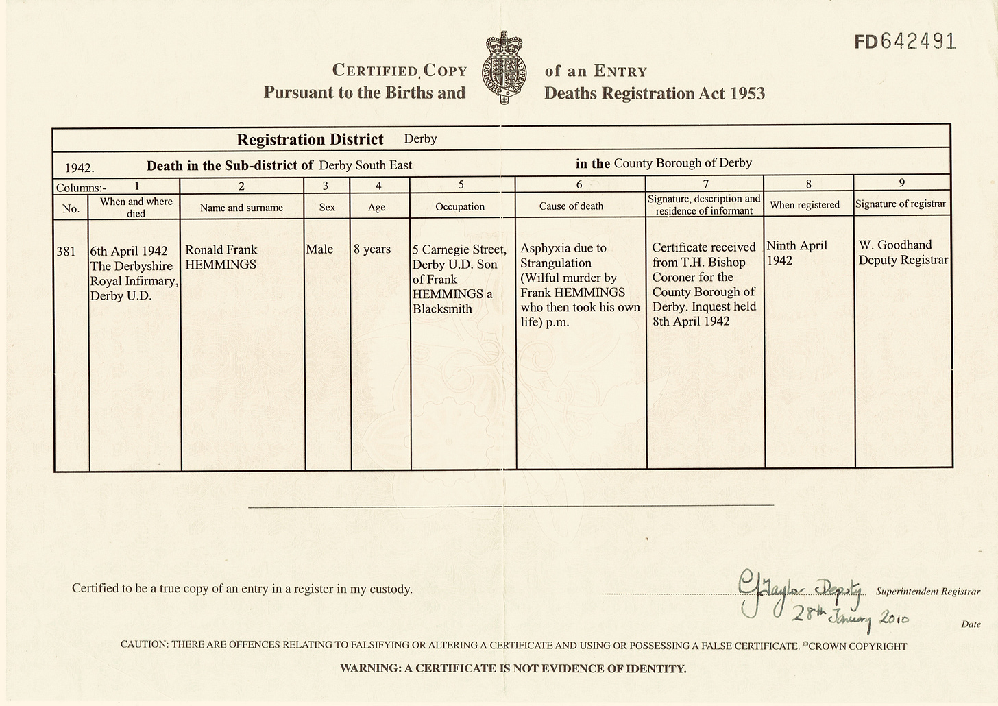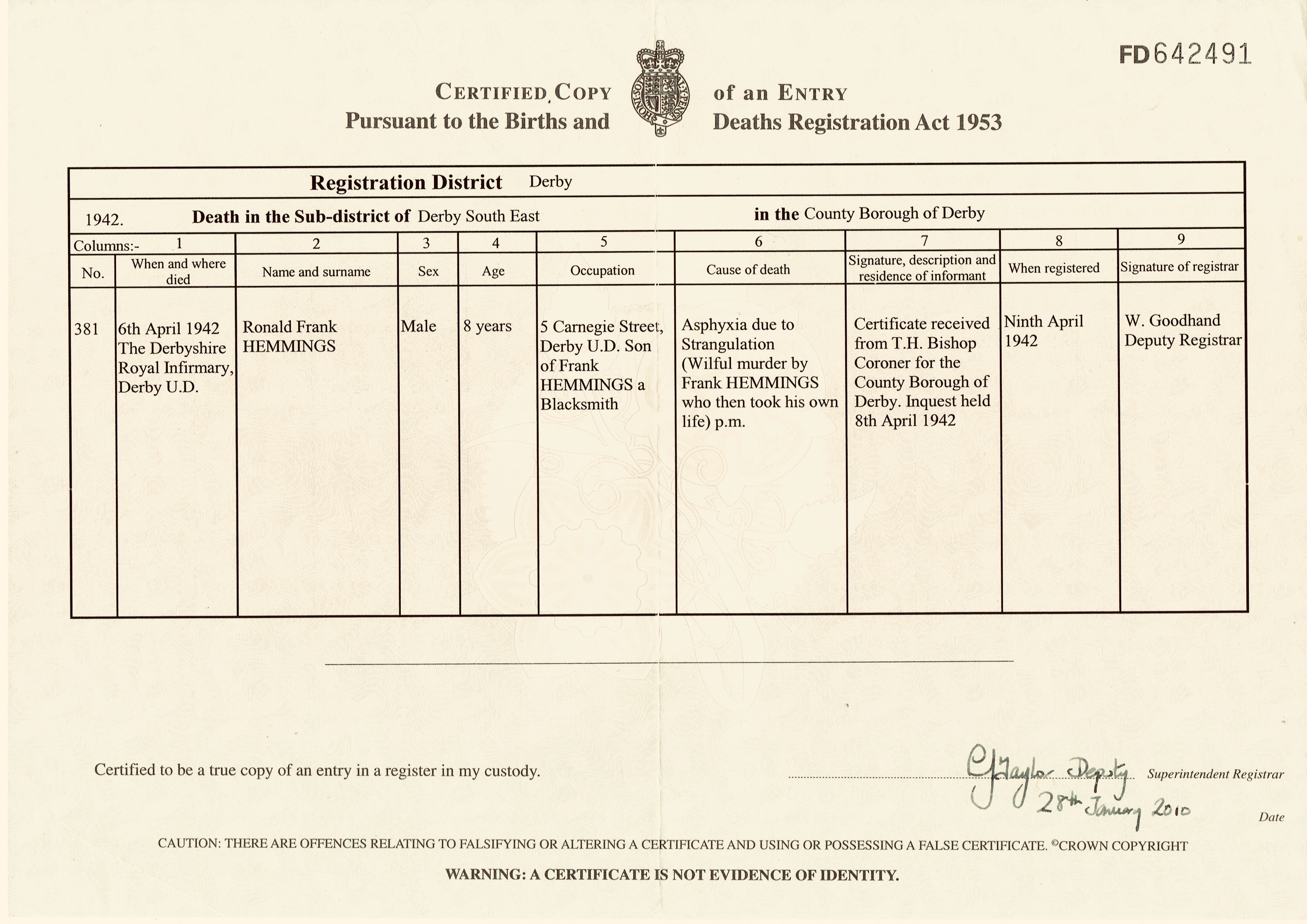 Ronald, my teen father’s eight year old brother had been killed. I was that same age as him. He had been “unwell,” left one evening in the care of their father, Frank. My grandmother Doris had gone next door to borrow the Derby Telegraph.