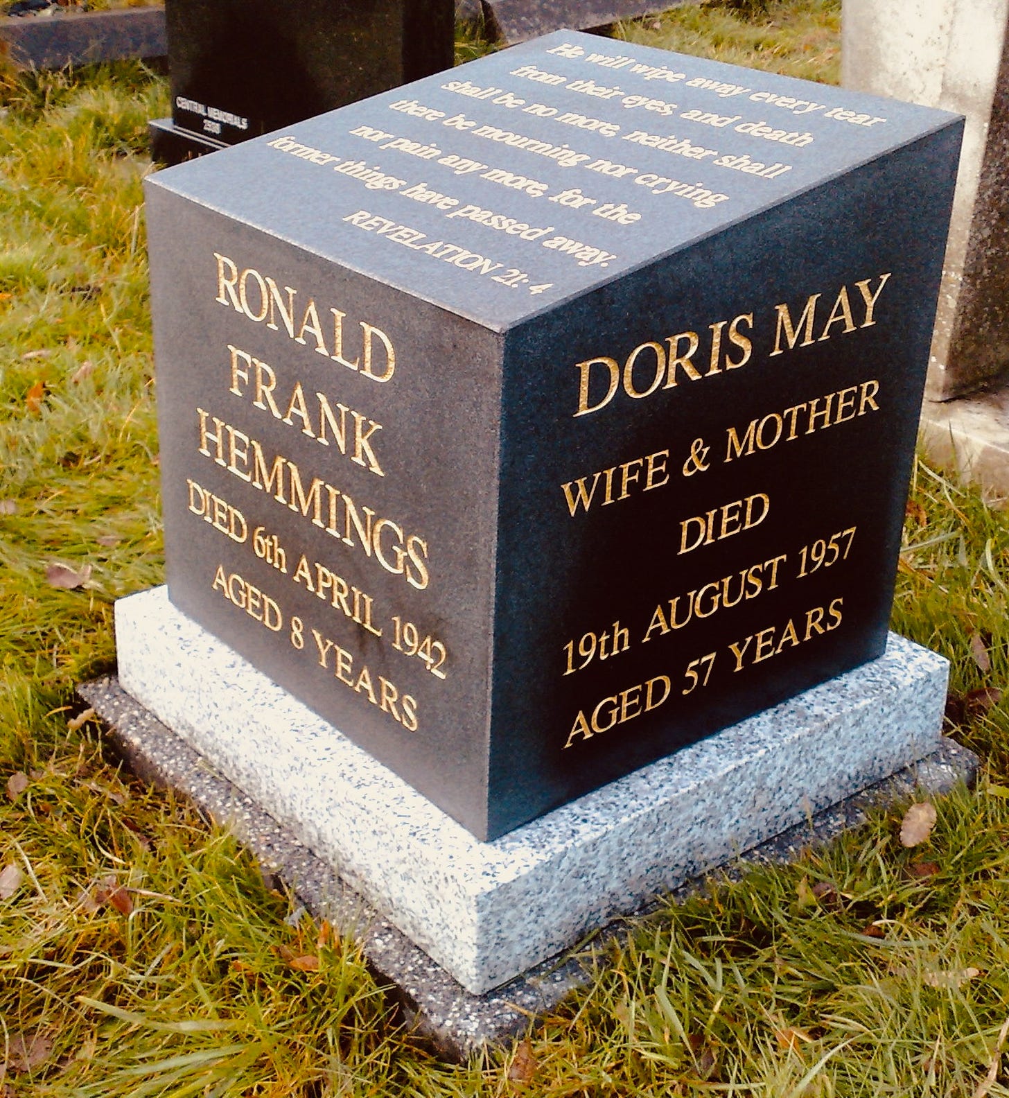 In 2010 I replaced that slyly worded stone with a new, bigger, braver memorial block. Ronald’s name was placed at the centre, his parents on either side. On sloped top of the memorial cube are the healing, hopeful words from Revelation 21:4: