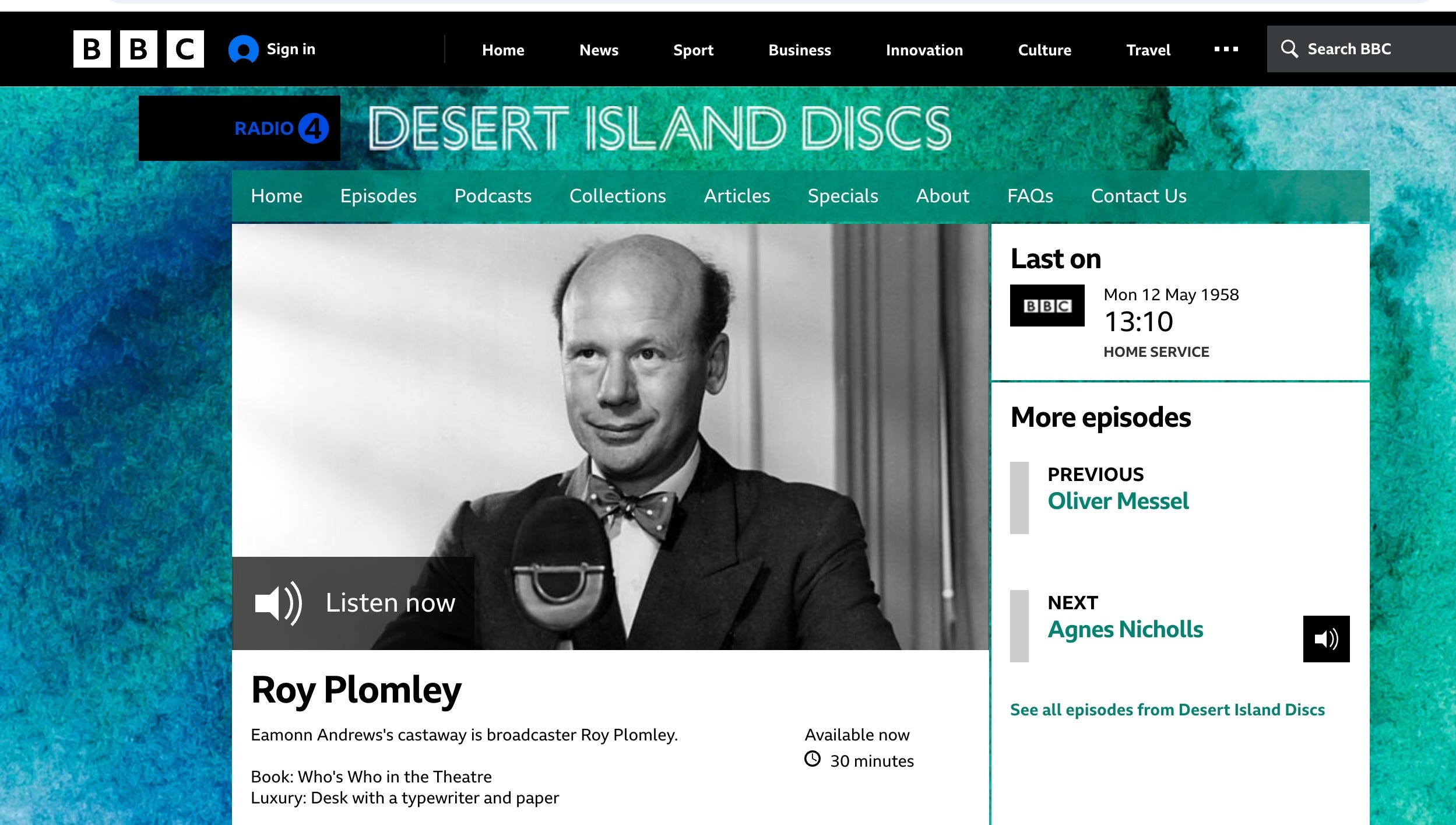 The radio was tuned to Desert Island Discs. Roy Plumley, the ever-courteous BBC presenter, introduced his guest and began the familiar interview about life and music.